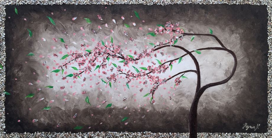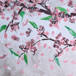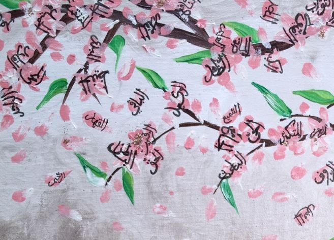 Das klassische „Asma ul Husna“ (die 99 Namen Gottes) ist in diesem Gemälde auf den Blüten und Blättern eines durch Sturm gebogenen abstrakten Baumes versehen. Die Blüten sind in einem pastellenen Rosè-Ton gemalt, die mit den überwiegend braunen Tönen gut harmonisieren. Der Rand des Werkes ist mit perlmuttfarbenen, gebrochenen Muschelstücken einzeln besetzt worden, was ebenfalls den Naturcharakter des Bildes unterstreicht. Die Namen bzw. Attribute Gottes, welches Sein Wesen und Seine Werke implizieren, sind durch verschiedene Wege ergründbar. Eines dieser Wege ist es durch die Beobachtung der Natur zu diesen Erkenntnissen zu gelangen, sei es durch das Betrachten und Analysieren eines Baumes, der durch ein Sturm in Bewegung gesetzt wird und seine Blüten und Blätter verliert, als eine